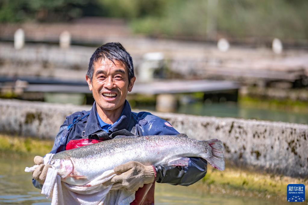 10月11日,在重慶市城口縣蓼子鄉明安村冷水魚(yú)產(chǎn)業(yè)基地,工作人員在展示剛剛捕撈的虹鱒魚(yú)。