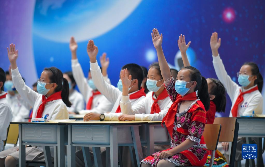 10月12日,學(xué)生在云南省大理新世紀中學(xué)收看“天宮課堂”第三課時(shí)舉手提問(wèn)。 新華社記者 陳欣波 攝