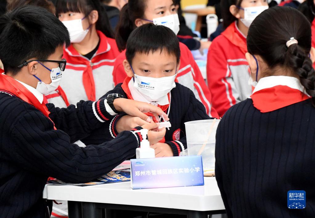 10月12日,學(xué)生在河南省科技館收看“天宮課堂”第三課時(shí)做實(shí)驗。 新華社記者 李安 攝