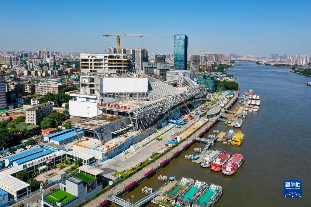 廣東美術(shù)館、廣東非物質(zhì)文化遺產(chǎn)展示中心、廣東文學(xué)館“三館合一”建筑長(cháng)350米,高近80米,宛如一艘“文化巨輪”揚帆珠江(10月12日攝,無(wú)人機照片)。