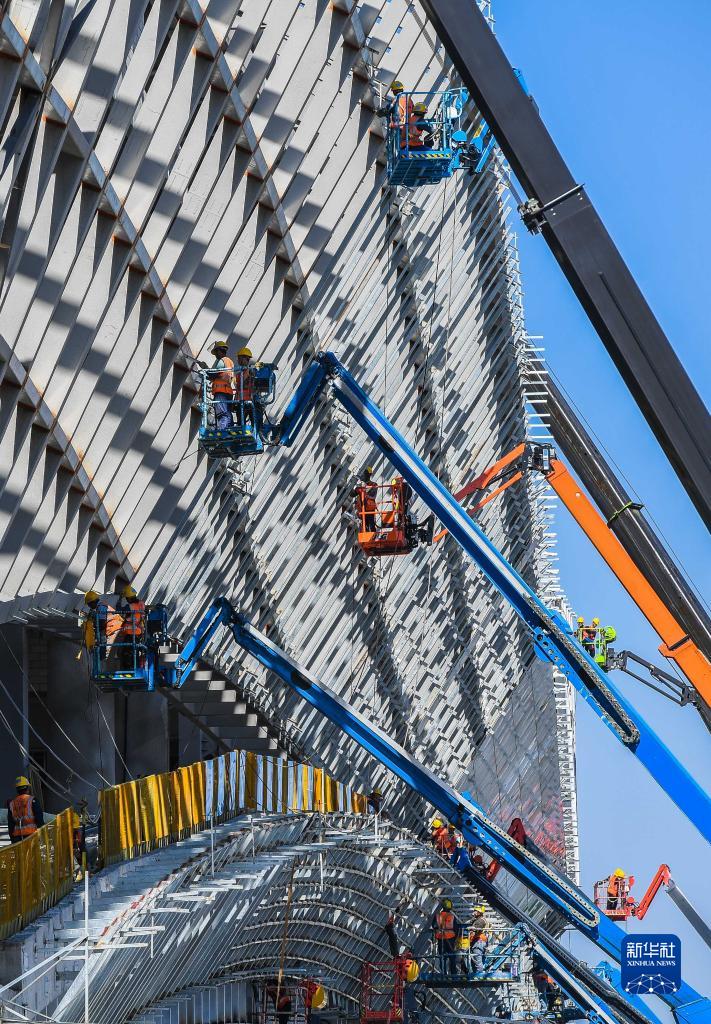 建設者在廣東美術(shù)館、廣東非物質(zhì)文化遺產(chǎn)展示中心、廣東文學(xué)館“三館合一”項目進(jìn)行幕墻施工(10月12日攝)。