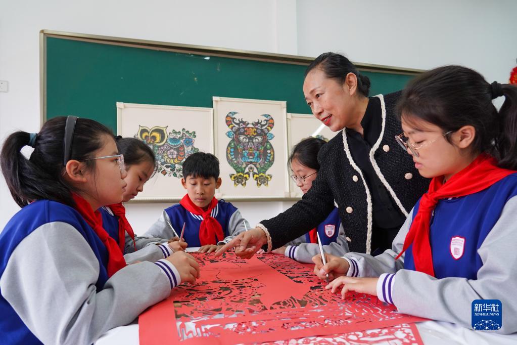10月13日,張莊小學(xué)學(xué)生在老師指導下學(xué)習剪紙。