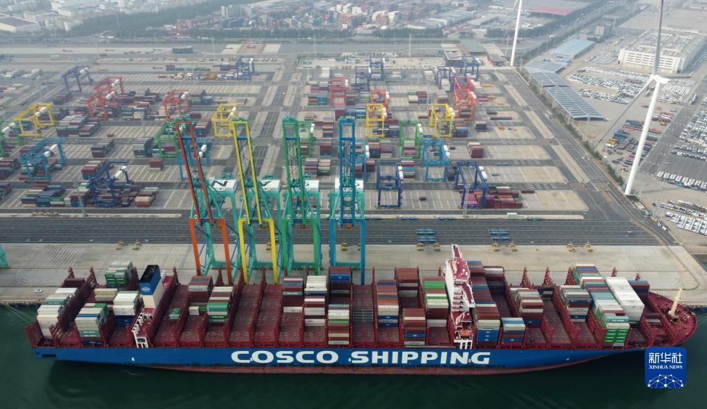 10月13日,“中遠海運天秤座”貨輪??吭谔旖蚋郾苯蹍^C段智能化集裝箱碼頭進(jìn)行裝卸作業(yè)(無(wú)人機照片)。 新華社記者 趙子碩 攝