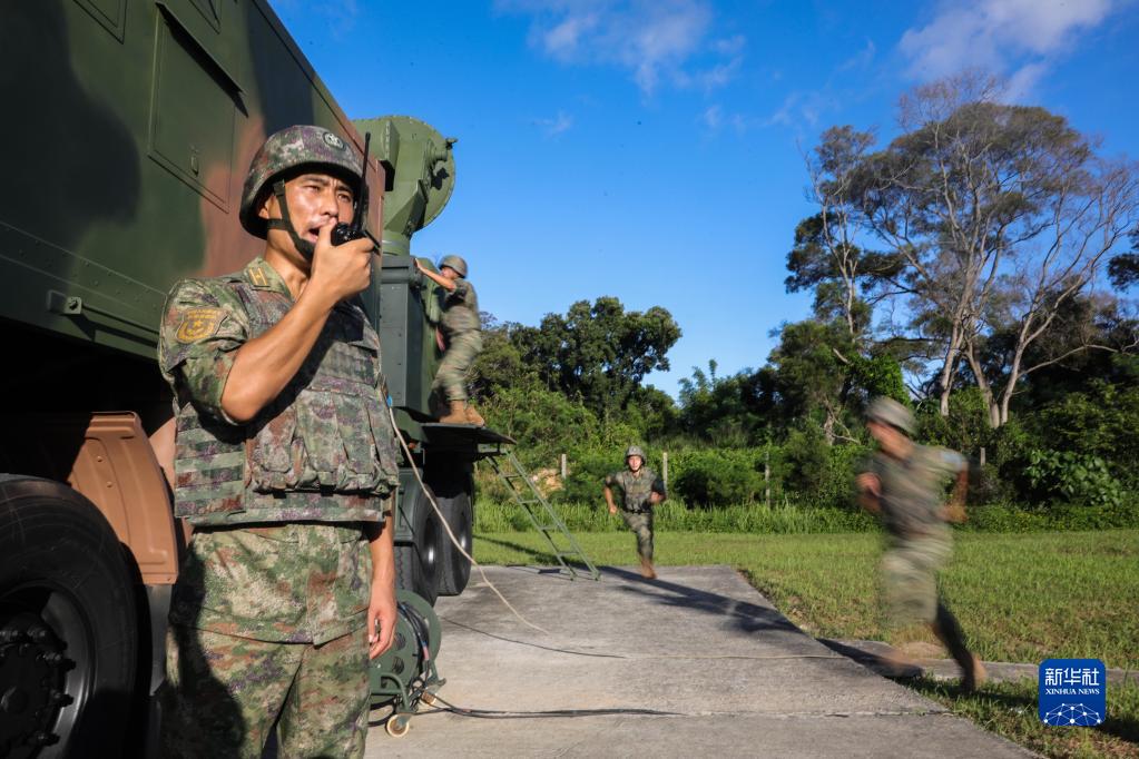 駐香港部隊某團防空營(yíng)營(yíng)長(cháng)王海旭(左)在訓練中下達作戰指令(2022年7月21日攝)。新華社發(fā)(田越洋 攝)