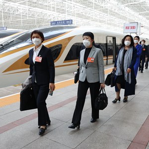 10月13日,來(lái)自?xún)让晒抛灾螀^的黨的二十大代表乘高鐵抵達北京北站。這是當日首個(gè)抵京的京外代表團。新華社記者 張玉薇 攝