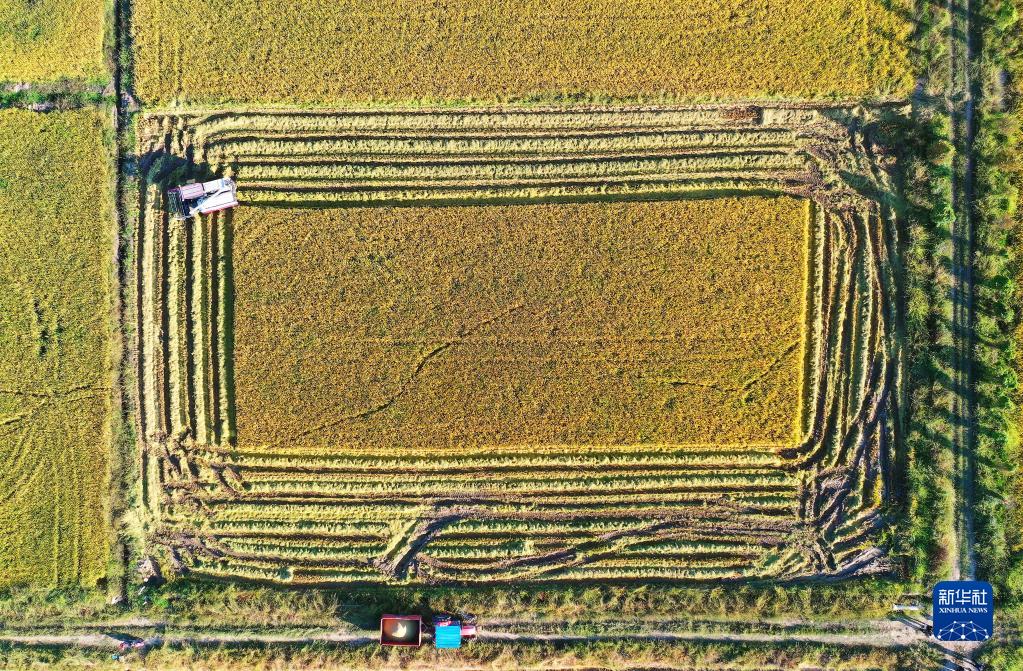 在江西省南昌縣大田農社,無(wú)人駕駛收割機收割成熟的水稻(10月11日攝)。