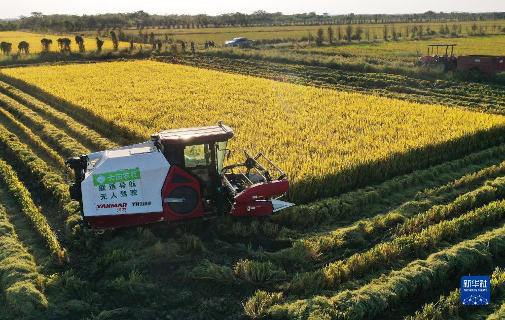 在江西省南昌縣大田農社,無(wú)人駕駛收割機在收割水稻(10月11日攝)。無(wú)人駕駛收割機裝有精準導航系統,提高了收獲精度,降低了糧食損耗。