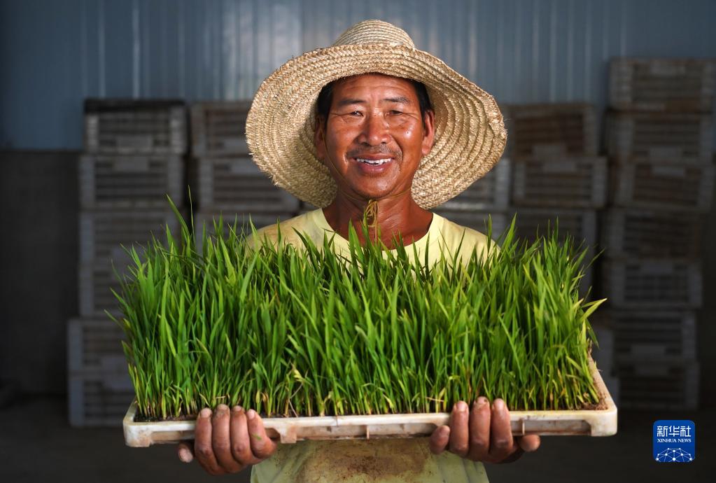 在江西省南昌縣大田農社,農民手捧秧盤(pán)展示秧苗(7月20日攝)。