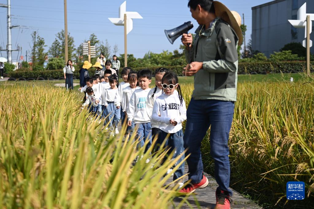 10月14日,浙江省湖州市吳興高新區靈糧農場(chǎng)的農技人員(右一)帶領(lǐng)小朋友參觀(guān)稻田,介紹種糧知識。