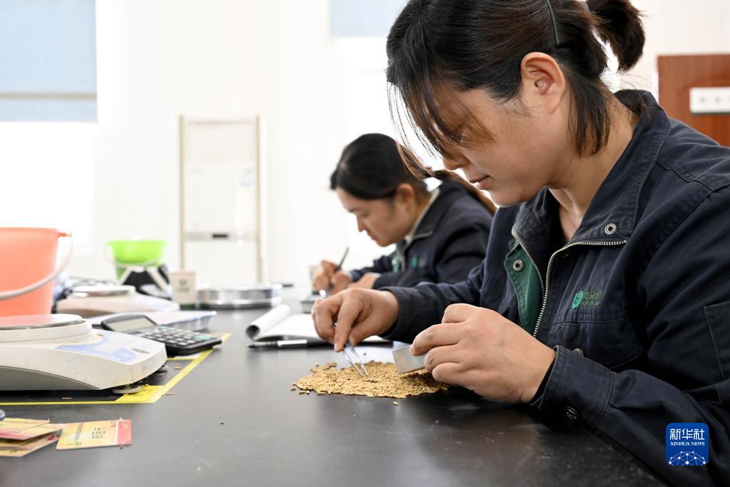 10月13日,在中央儲備糧合肥直屬庫有限公司本部,工作人員對等待入庫的稻谷進(jìn)行檢測。