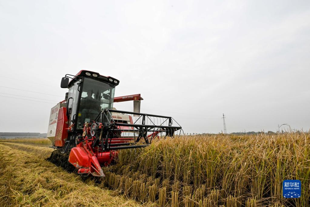 10月13日,在天津市津南區小站鎮坨子地村,水稻收割機在田間作業(yè)。