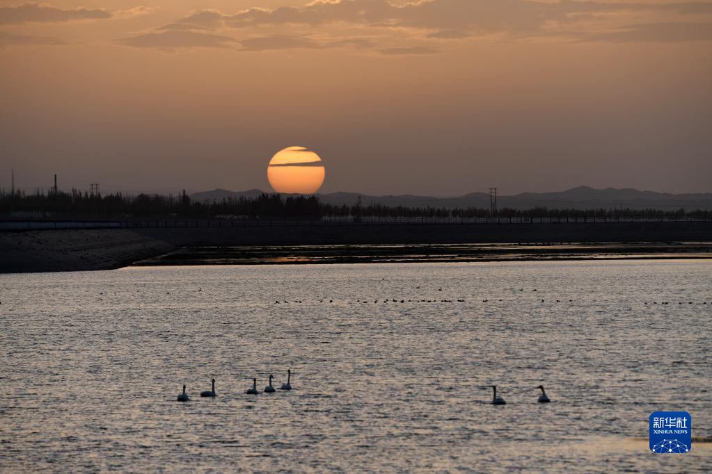 10月5日日落時(shí)分,在甘肅省阿克塞哈薩克族自治縣的冬不拉水庫,天鵝和野鴨在湖中戲水。