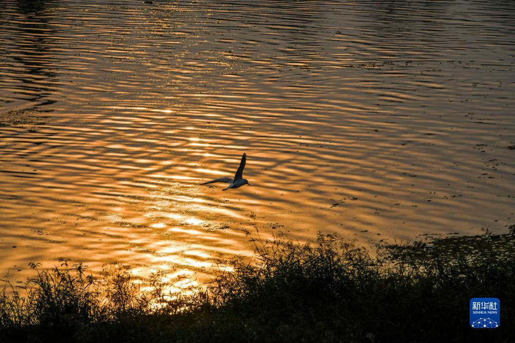 10月12日傍晚,一只水鳥(niǎo)在河北省遵化市沙河上飛舞。