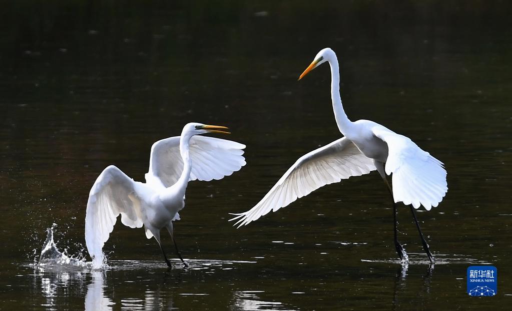 金秋時(shí)節,鷺鳥(niǎo)在山東省滕州市的荊河覓食、嬉戲(10月9日攝)。