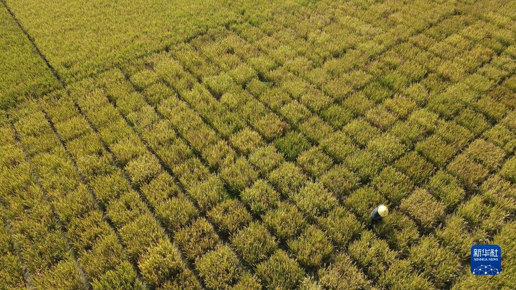 10月15日,在牛角大圩水稻試驗示范基地內,安徽省農業(yè)科學(xué)院水稻研究所工作人員夏加發(fā)在進(jìn)行稻種收集(無(wú)人機照片)。