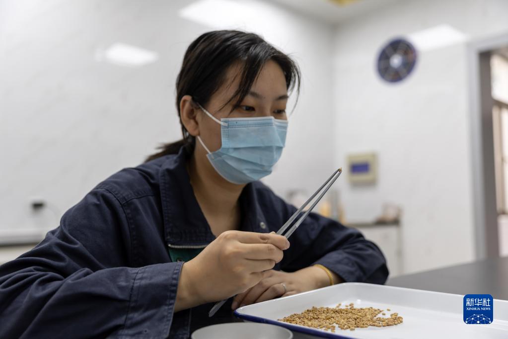 10月14日,在中央儲備糧上海直屬庫檢測中心,徐燁挑揀樣品中的不完善粒。