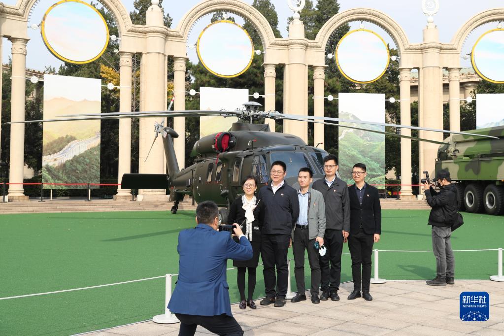 觀(guān)眾在“奮進(jìn)新時(shí)代”主題成就展室外展區與直升機合影(10月12日攝)。新華社記者 許雅楠 攝