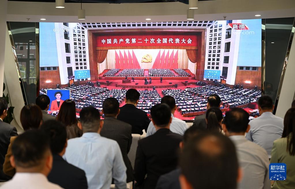 10月16日,在天津市濱海新區濱海-中關(guān)村科技園,企業(yè)員工在收看中國共產(chǎn)黨第二十次全國代表大會(huì )開(kāi)幕會(huì )。