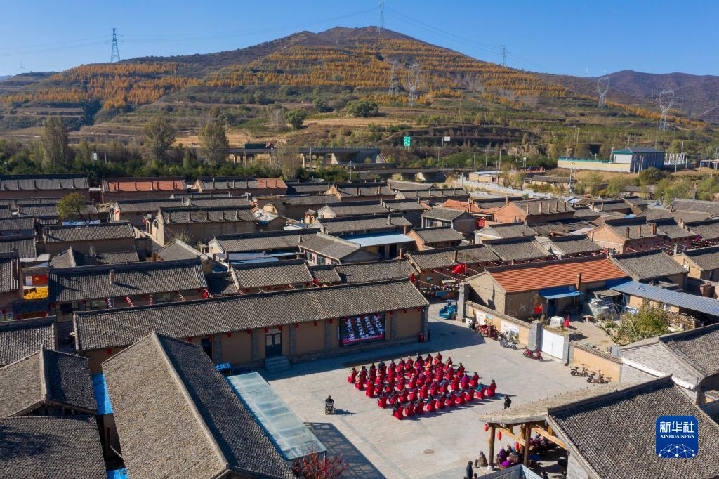 10月16日,山西省忻州市岢嵐縣宋家溝村村民在觀(guān)看中國共產(chǎn)黨第二十次全國代表大會(huì )開(kāi)幕會(huì )(無(wú)人機照片)。