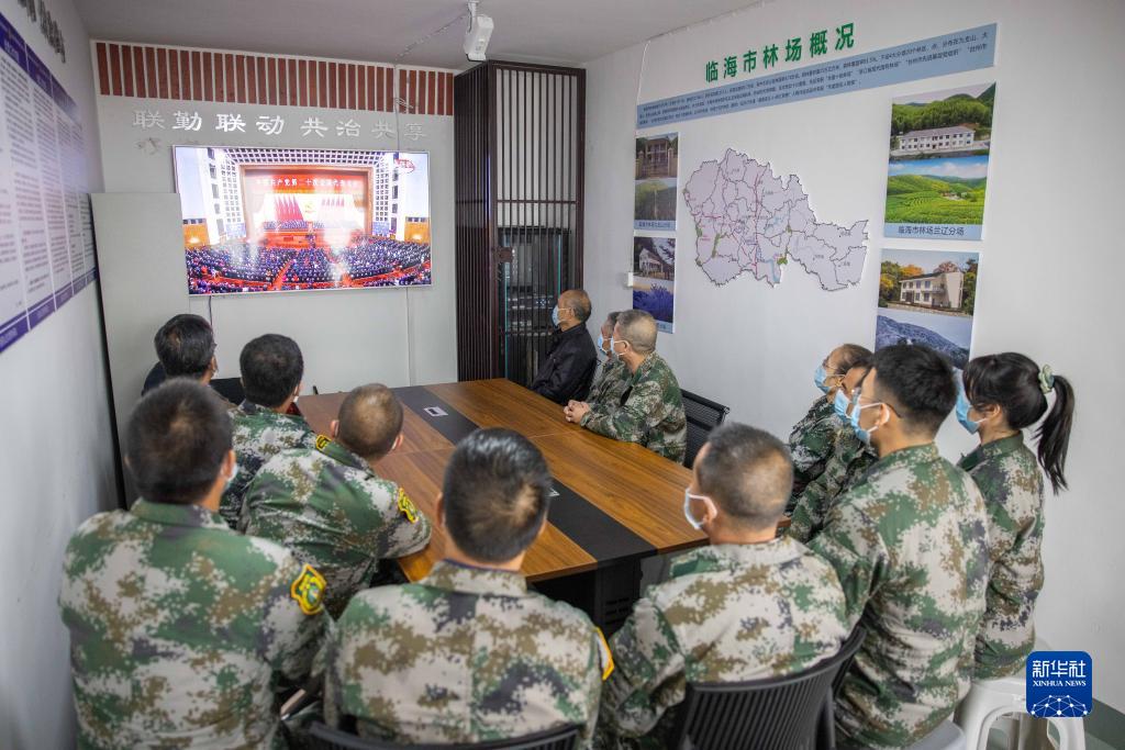 10月16日,浙江省臺州臨海市林場(chǎng)職工在位于括蒼山的林場(chǎng)內收看中國共產(chǎn)黨第二十次全國代表大會(huì )開(kāi)幕會(huì )。