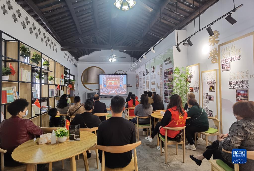 10月16日,在重慶市合川區合陽(yáng)城街道新時(shí)代文明實(shí)踐點(diǎn),居民收看中國共產(chǎn)黨第二十次全國代表大會(huì )開(kāi)幕會(huì )。
