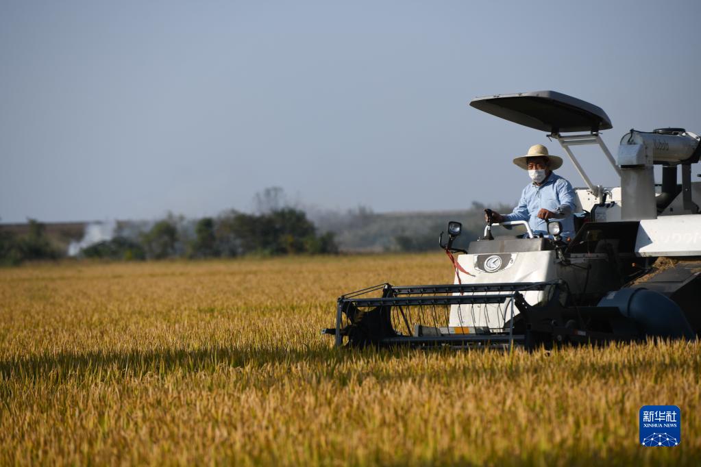 10月16日,在安徽省巢湖市槐林鎮,農機手操作收割機在田間收割水稻。