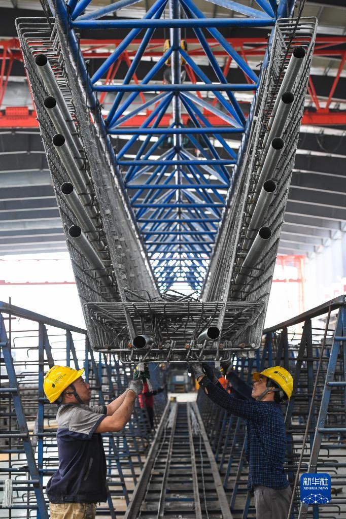 10月18日,工人在黃茅??绾Mǖ乐腔哿簣?chǎng)綁扎預制箱梁鋼筋籠。