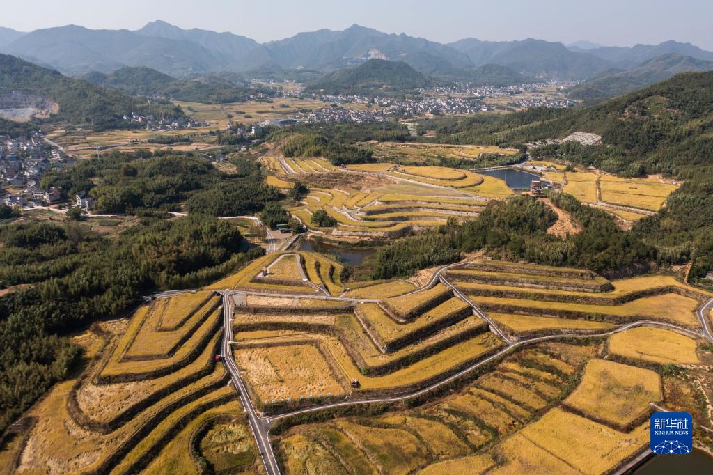 10月19日拍攝的杭州市富陽(yáng)區新登鎮潘堰村的梯田水稻(無(wú)人機照片)。該村通過(guò)對低丘緩坡實(shí)施土地整理,建造梯田,同時(shí)采用防滲水膜節水法,建成了300畝左右“海綿農田”,雨季降水可以蓄積到農田下的地下隱形水庫供調劑使用。
