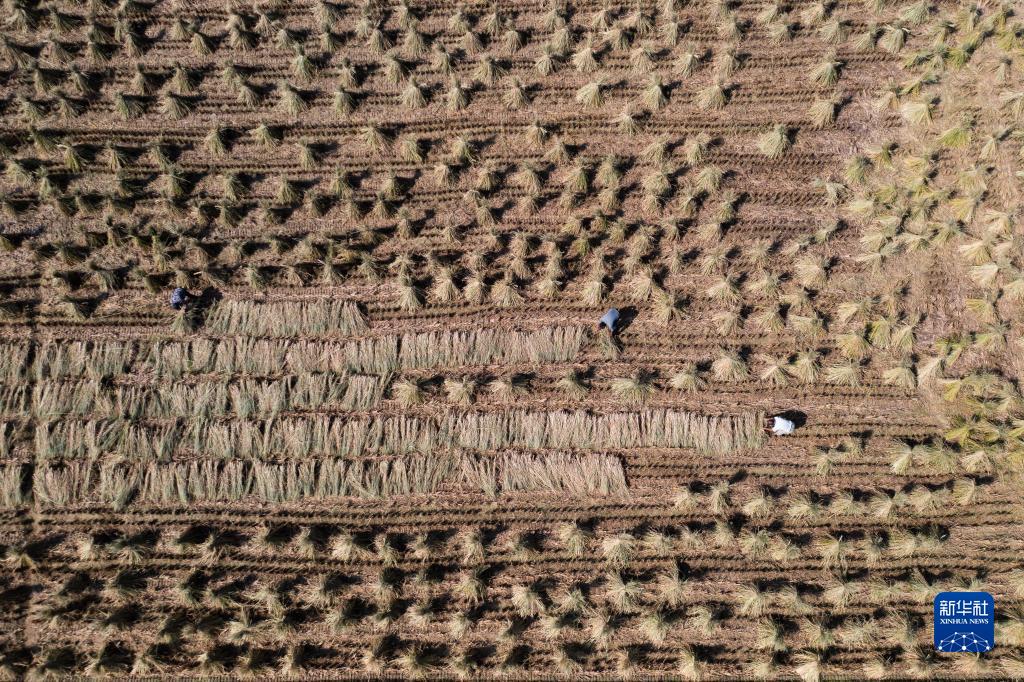 10月19日,種植戶(hù)在杭州市富陽(yáng)區漁山鄉糧食生產(chǎn)功能區的稻田內捆扎秸稈(無(wú)人機照片)。漁山鄉糧食生產(chǎn)功能區毗鄰富春江,面積1700余畝,采取統一品種布局、統一測土配方、統一機插、統一病蟲(chóng)害防治、統一機收、統一信息發(fā)布的“六統一”栽培技術(shù),成為富陽(yáng)成效顯著(zhù)的糧食生產(chǎn)示范基地之一。