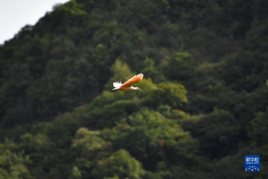 在位于秦嶺南麓的陜西寧陜縣寨溝村,朱鹮在天空中翱翔(10月10日攝)。
