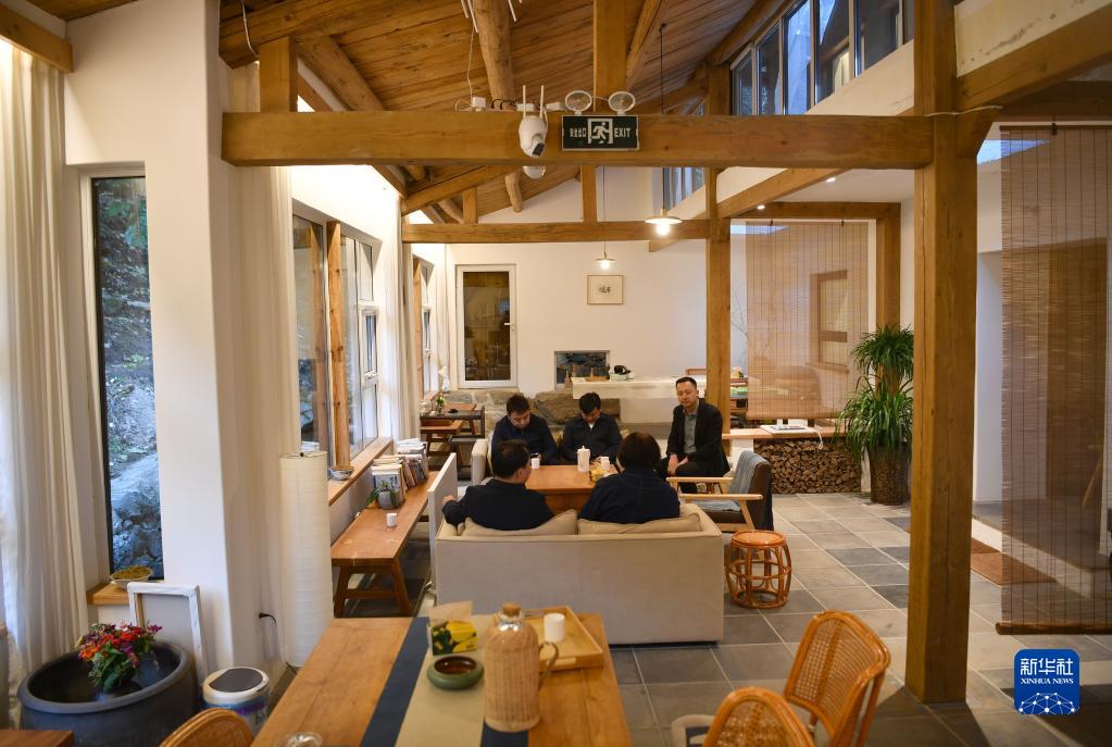 游客在位于秦嶺南麓的陜西寧陜縣沙溝村一間民宿的客廳內休息聊天(10月9日攝)。