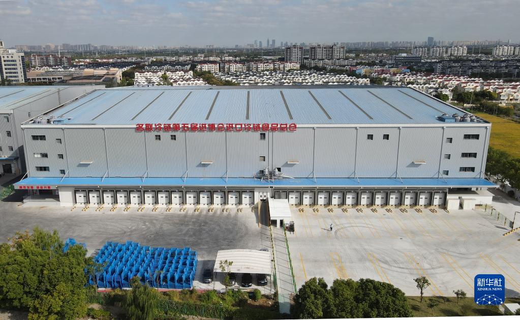 10月20日,空中俯瞰位于上海青浦區的名聯(lián)冷鏈第五屆進(jìn)博會(huì )進(jìn)口冷鏈食品總倉(無(wú)人機照片)。