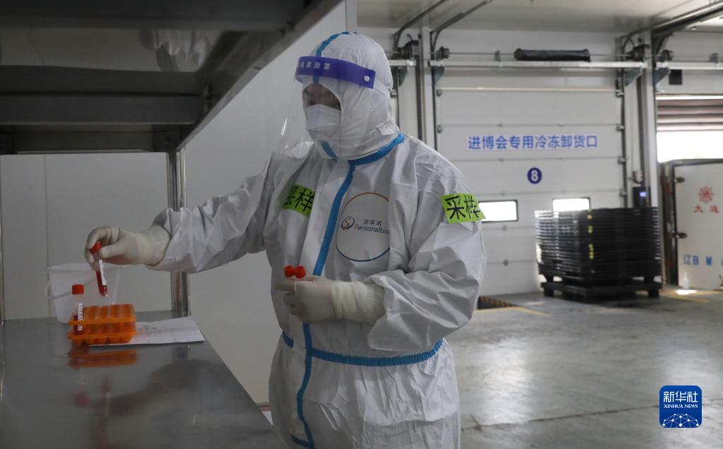 10月20日,一名核酸采樣工作人員在放置入倉的冷鏈食品展品核酸樣本。