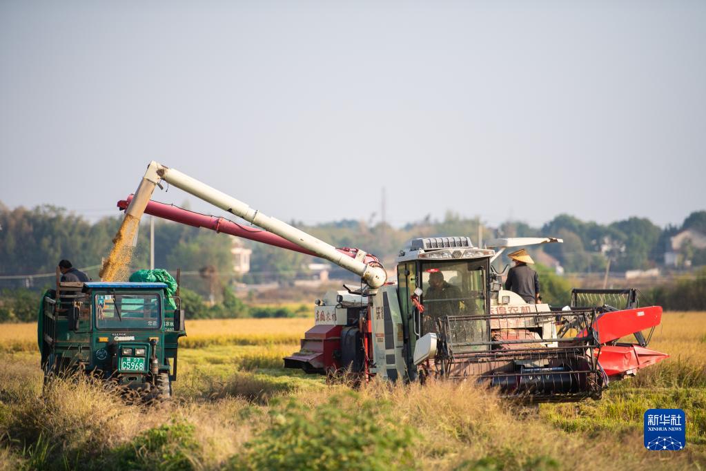 10月20日,在湖南省常德市鼎城區謝家鋪鎮,收割機把收好的稻谷轉放到運輸車(chē)里。