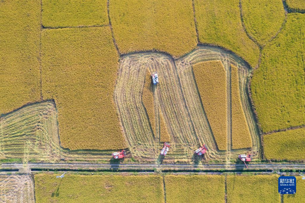 10月20日,在湖南省常德市鼎城區謝家鋪鎮,農民駕駛農機收割晚稻(無(wú)人機照片)。