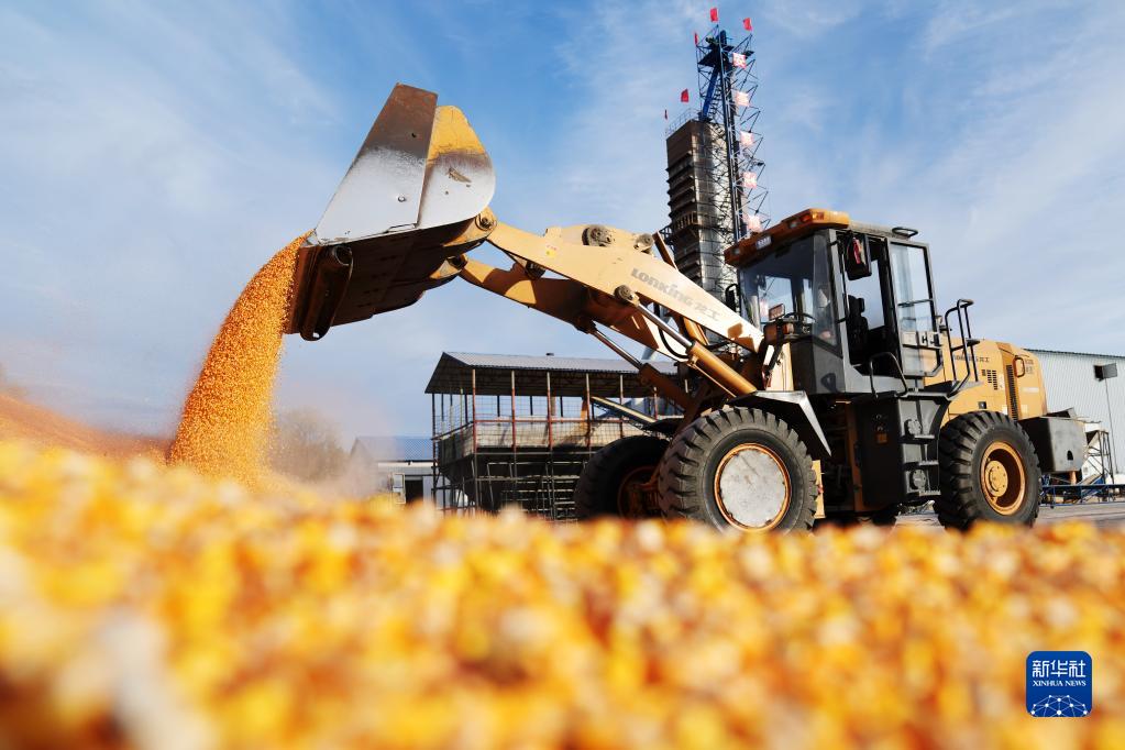 10月20日,在北大荒農墾集團有限公司北安分公司趙光農場(chǎng)有限公司,鏟車(chē)在一處曬場(chǎng)傾倒玉米。