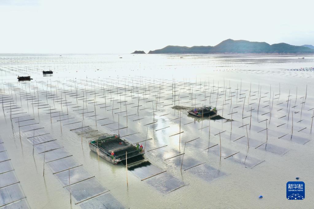 金秋十月,福建省寧德市霞浦縣6.5萬(wàn)畝海上養殖紫菜迎來(lái)收獲時(shí)節,漁民們操作收割船在大海中采收頭水紫菜,展開(kāi)一幅海上秋收畫(huà)卷。霞浦縣素有“中國紫菜之鄉”美譽(yù),形成紫菜育苗、種植、加工全產(chǎn)業(yè)鏈條,年產(chǎn)值近10億元。紫菜成為當地群眾增收致富的支柱產(chǎn)業(yè)。