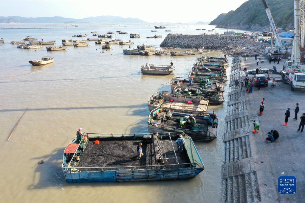 10月21日,漁民在福建省霞浦縣松山街道沙塘街村碼頭裝運新收割的頭水紫菜(無(wú)人機照片)。