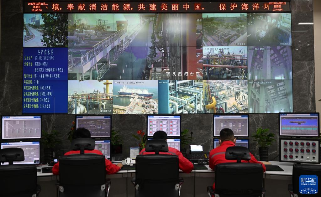 10月21日,工作人員在中國石化天津LNG接收站中控室內監測碼頭設備運行情況。