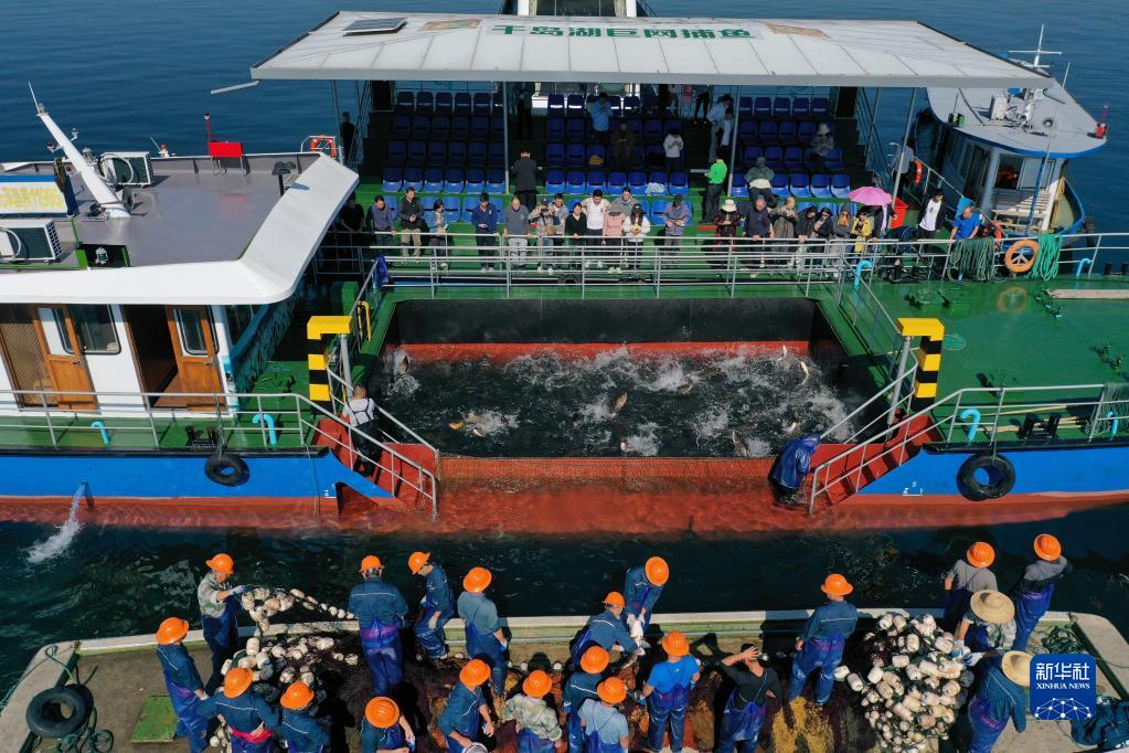 金秋時(shí)節,浙江省淳安縣千島湖黃山尖水域開(kāi)展巨網(wǎng)捕魚(yú),捕撈隊員合力拉網(wǎng),捕獲12萬(wàn)多斤鰱鳙魚(yú),沸騰魚(yú)鄉迎來(lái)豐收季。