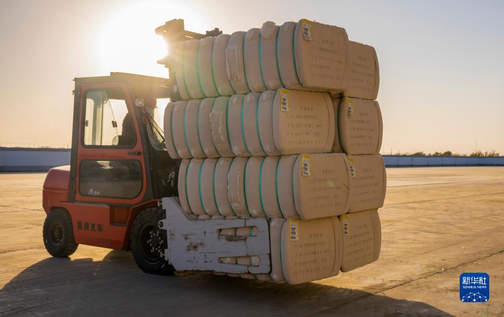 新疆沙灣市一家軋花廠(chǎng)的工人操作機械搬運新加工的皮棉(10月22日攝)。