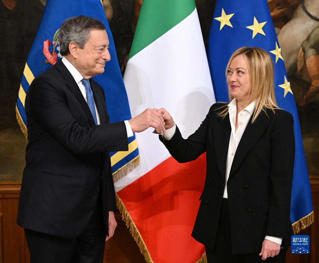 10月23日,在意大利羅馬,新任總理焦爾吉婭·梅洛尼(右)從前總理德拉吉手中接過(guò)主持內閣會(huì )議的鈴鐺。