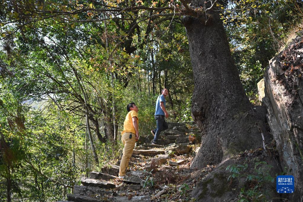 10月23日,在占西坑村后山山林,陳清(左)與一名村民查看大樹(shù)上生長(cháng)的野生鐵皮石斛。