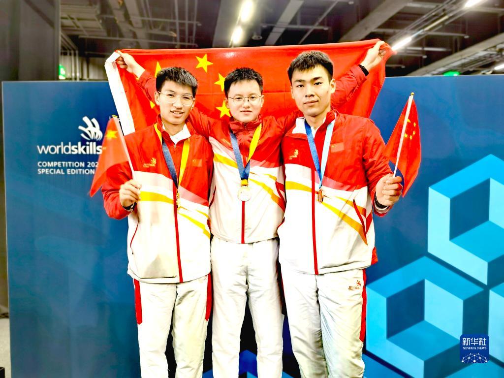 10月15日,在瑞士巴塞爾,獲得2022年世界技能大賽特別賽精細木工項目金牌的中國選手邵茹鵬(左)、獲得家具制作項目金牌的中國選手李德鑫(中)和獲得木工項目?jì)?yōu)勝獎的中國選手王縱橫在頒獎儀式后合影(手機拍攝)。