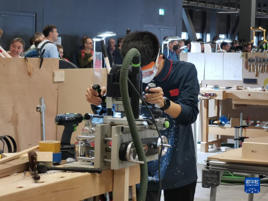 10月13日,在瑞士巴塞爾,中國選手邵茹鵬參加2022年世界技能大賽特別賽精細木工項目比賽(手機拍攝)。