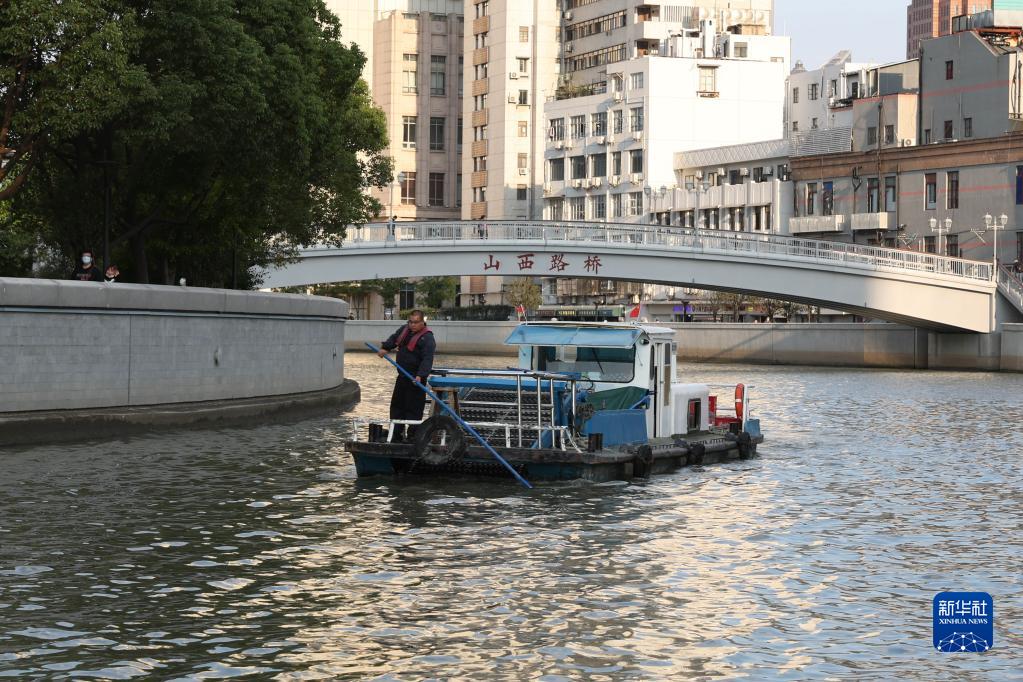 10月24日,河道保潔員在蘇州河水域打撈垃圾。