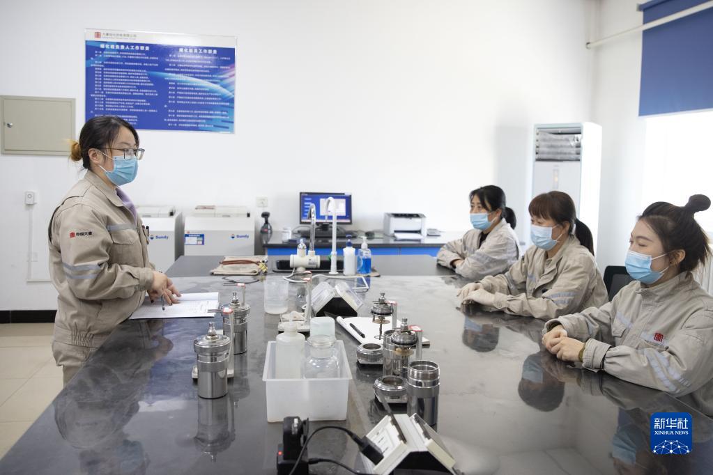10月24日,在大唐綏化熱電有限公司發(fā)電部煤化驗班實(shí)驗室內,代班長(cháng)于瀾(左一)給同事分配檢測任務(wù)。