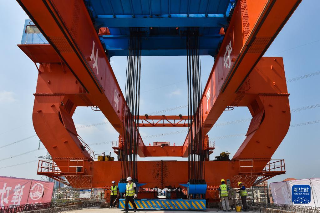 10月25日,施工人員在增江特大橋架梁現場(chǎng)進(jìn)行配合作業(yè)。
