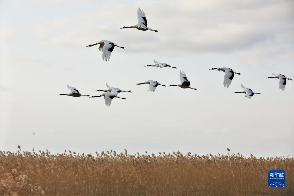 丹頂鶴在黑龍江扎龍國家級自然保護區自由翱翔(2022年10月21日攝)。 新華社發(fā)(宋燕軍 攝)
