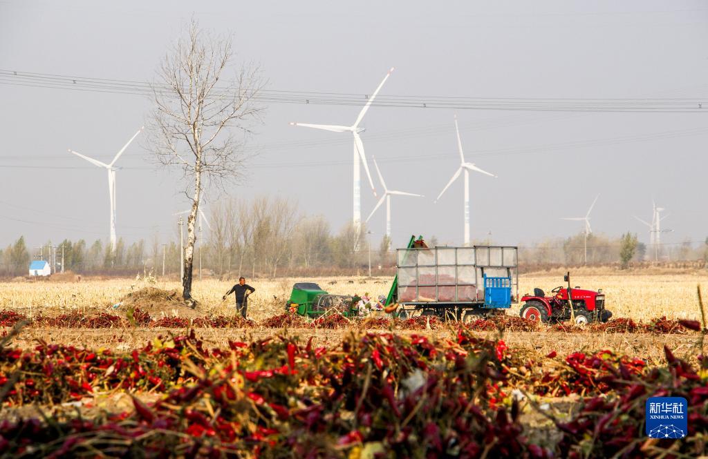 10月25日,在開(kāi)魯縣東風(fēng)鎮東方紅村,村民在田間收獲紅干椒。